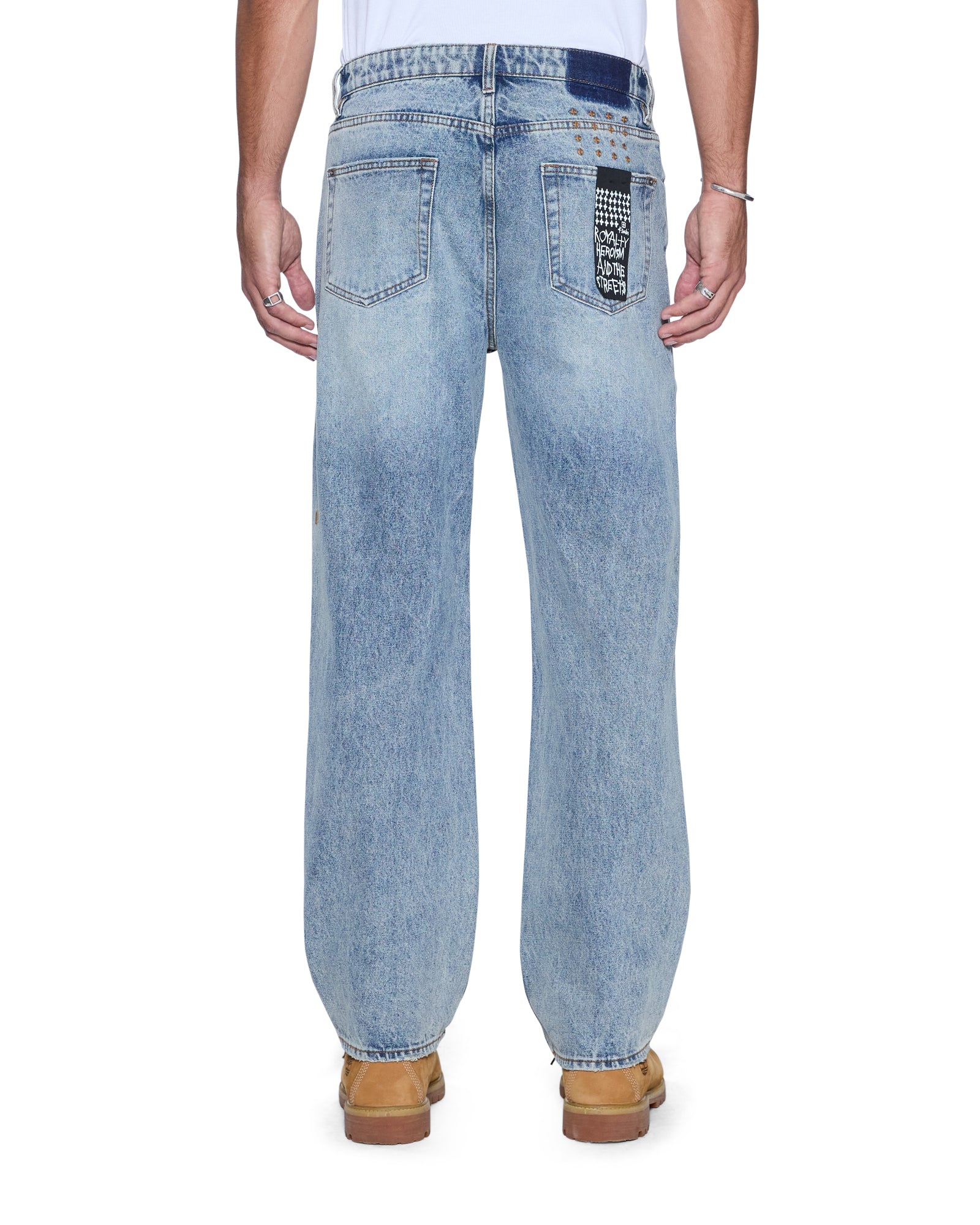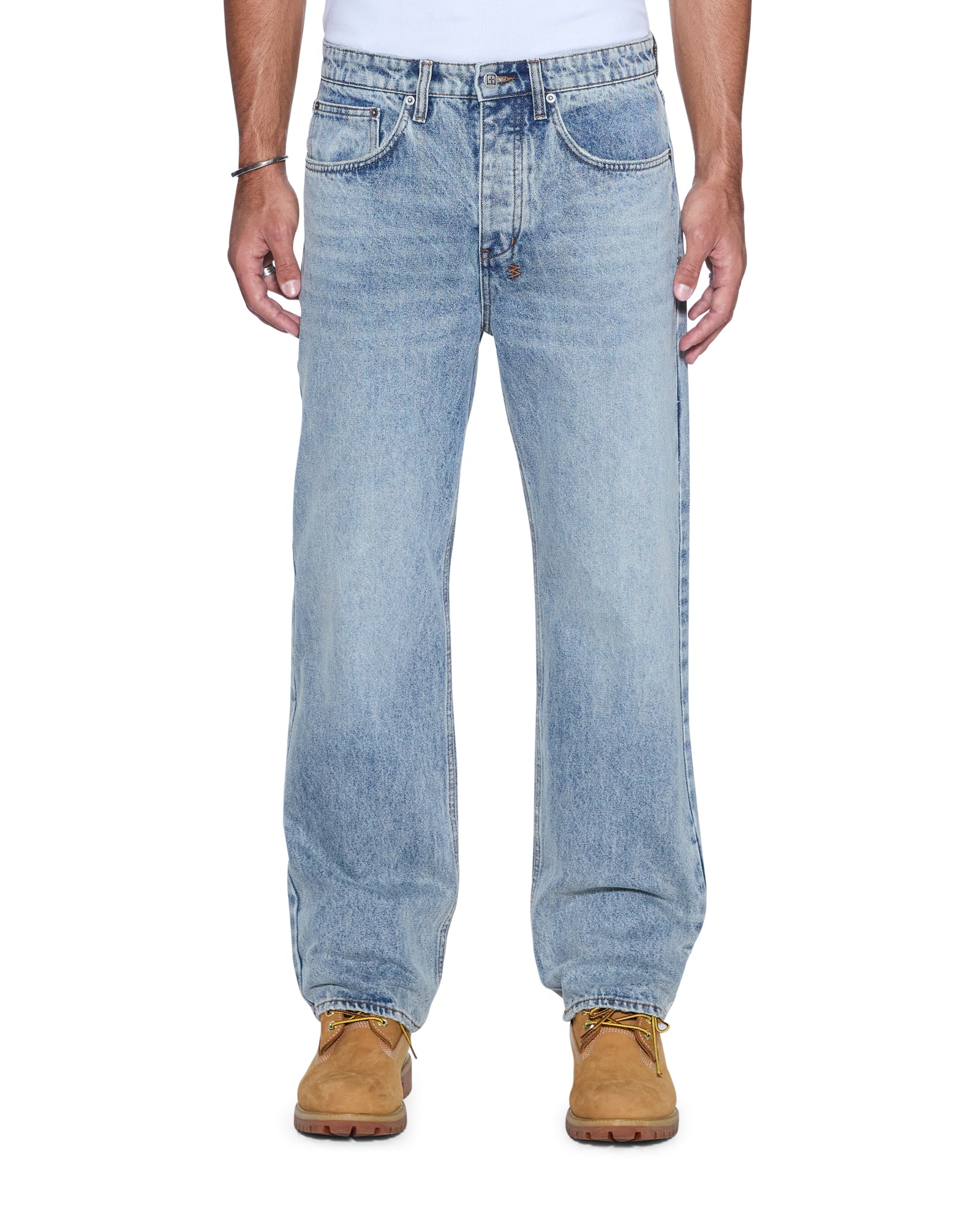 The Anti K Champagne Blue is a mid rise, relaxed straight jean with a regular leg opening and heavy stacking at the ankles. This style is made from a premium rigid denim featured in a light wash. The jean is detailed with light seam grinding, a ghost patch on the back and classic Ksubi branding.