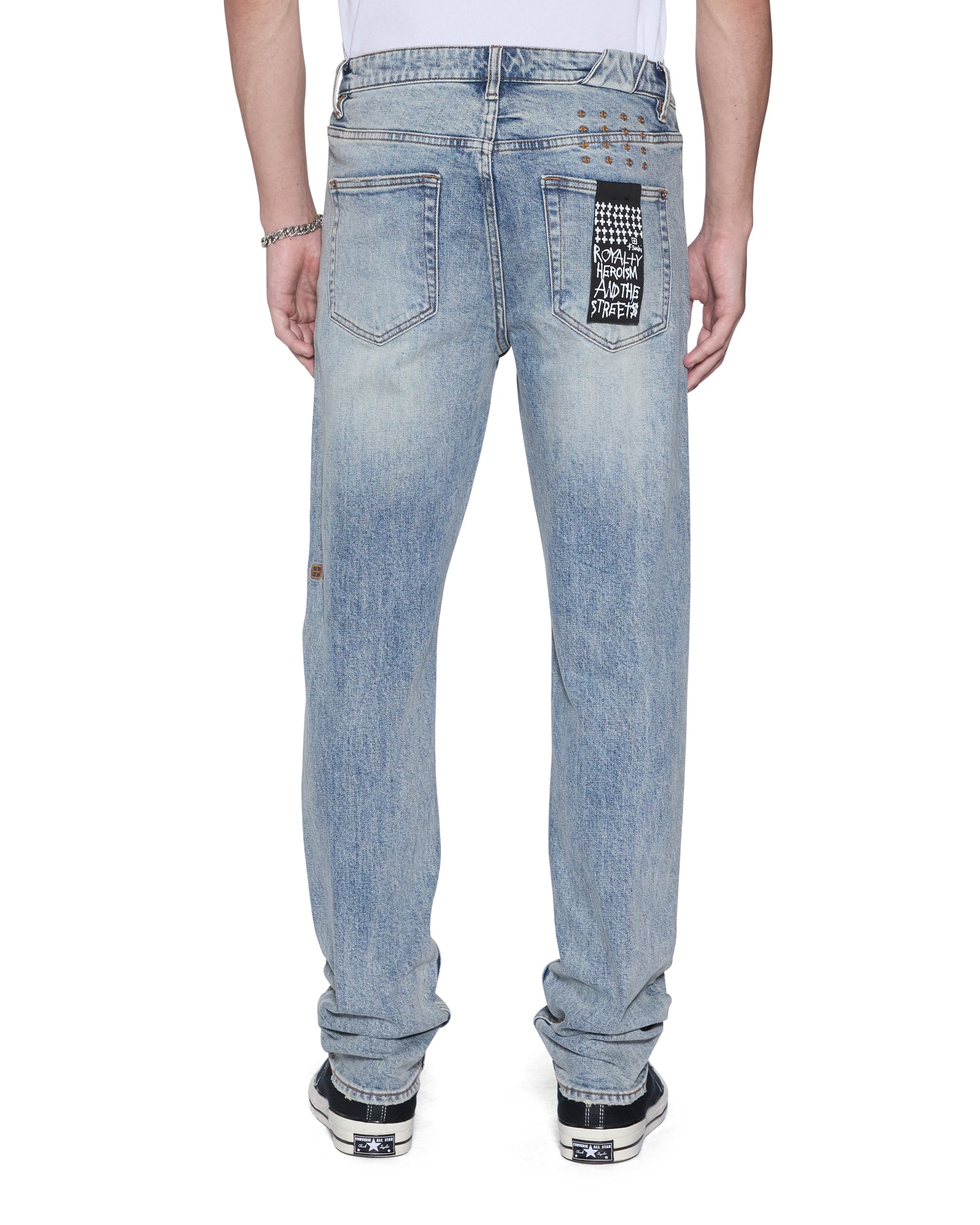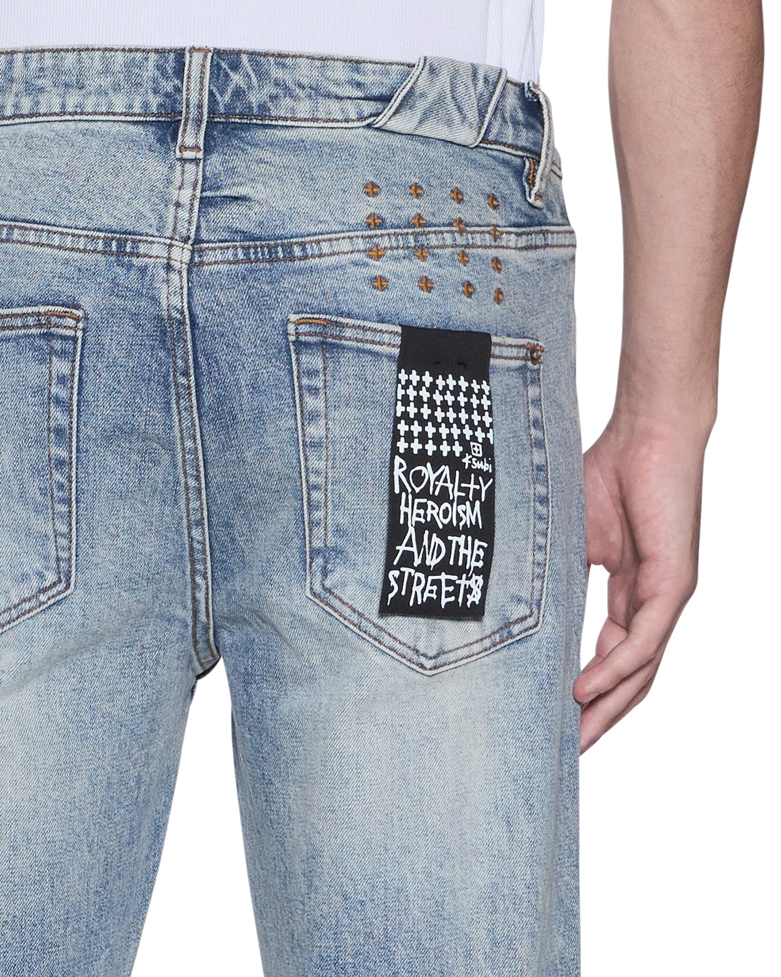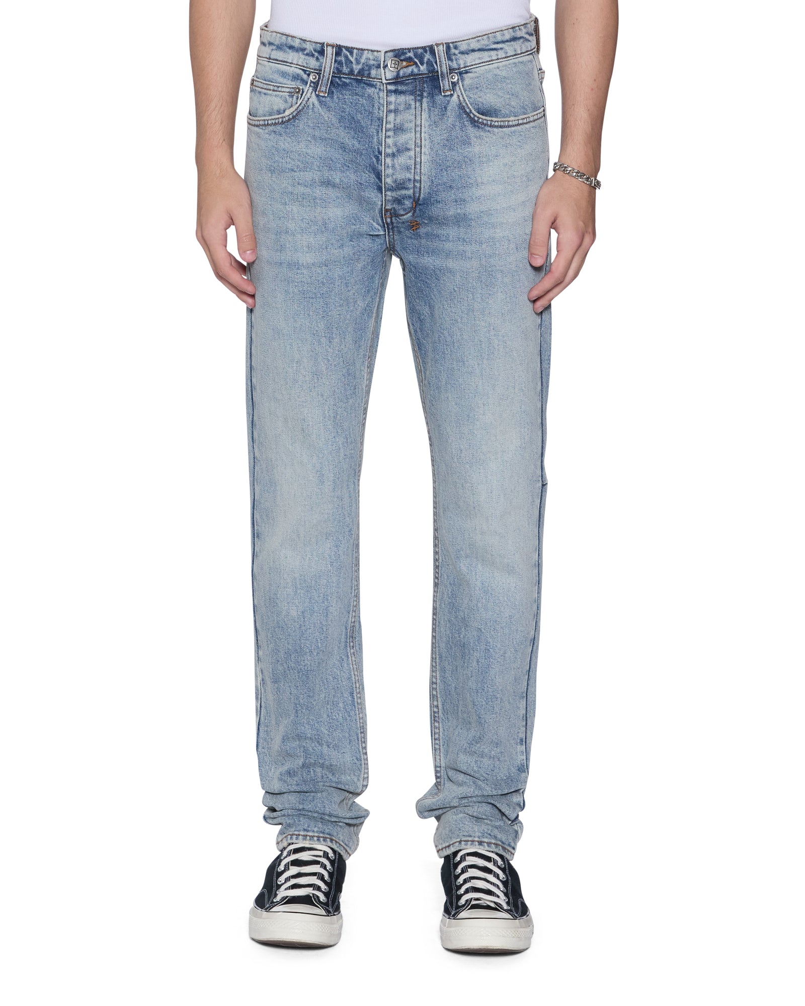 The Hazlow Portland Blue is a mid-rise relaxed straight-leg jean with a regular leg opening. Made from premium rigid denim with a heavy stone and acid wash, it is finished with signature t-box and 4x4 embroidery, ghost patching detailing, and Ksubi branded hardware.