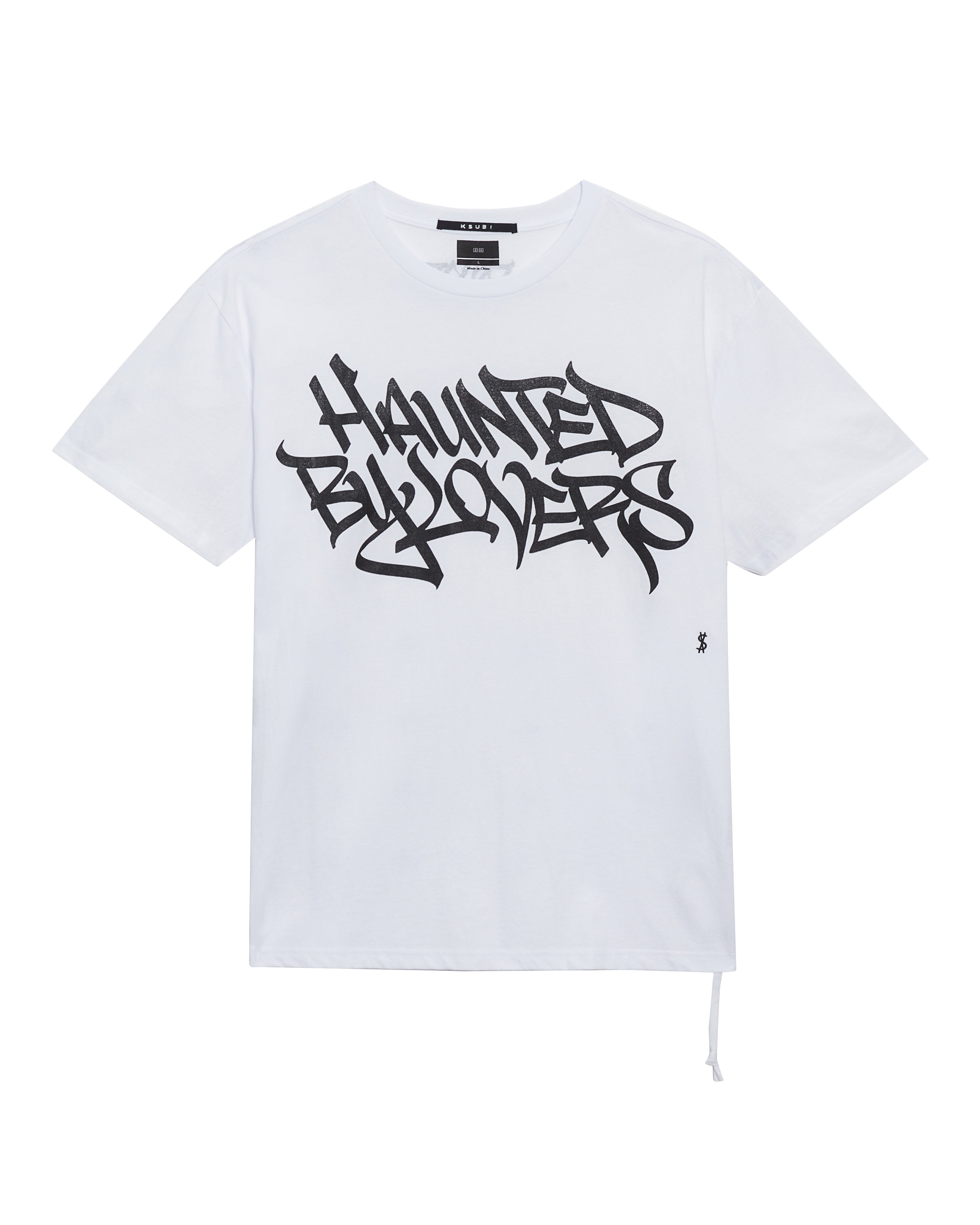 The Faust Biggie SS Tee Optic White is an oversized fit featured in a white colourway. Constructed from a premium cotton open ended jersey, the tee is garment dyed and finished with an aged wash. This style features a printed "Haunted By Lovers" graphic in Faust's signature font across the front chest, Faust's tag on the center back neckline, the original Ksubi oversized back 4x4 cross print, raw back hem detail, front cross dollar embroidery, reverse overlocked side seams, signature rats tail and Ksubi t-box printed branding.