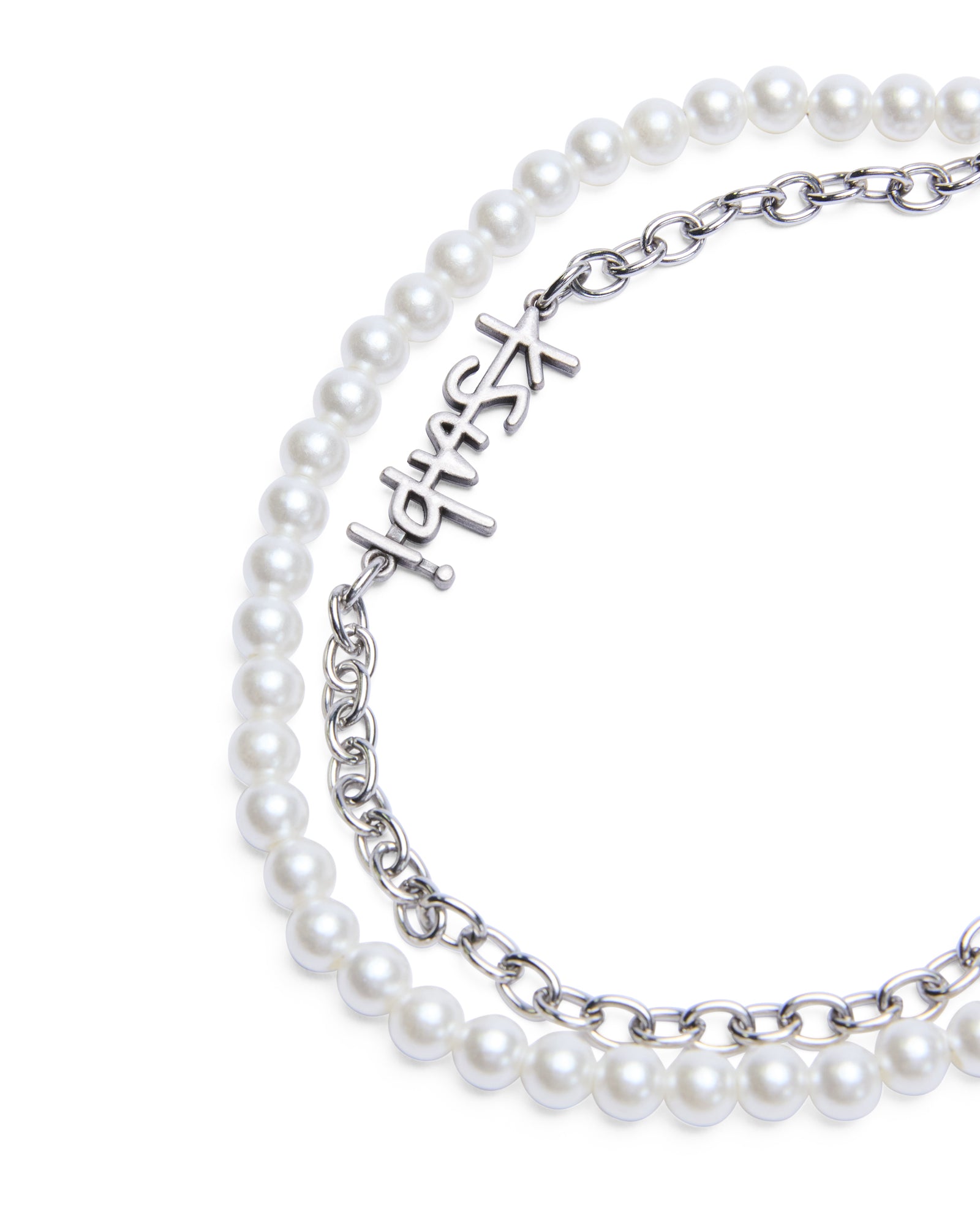 The 1999 Chains Phone Wrist Strap features a luxe faux pearl strand paired with a stainless steel chain and finished with a polished stainless steel Ksubi logo charm. Designed to attach to most phone cases, it offers a functional yet elevated way to carry and style your device.