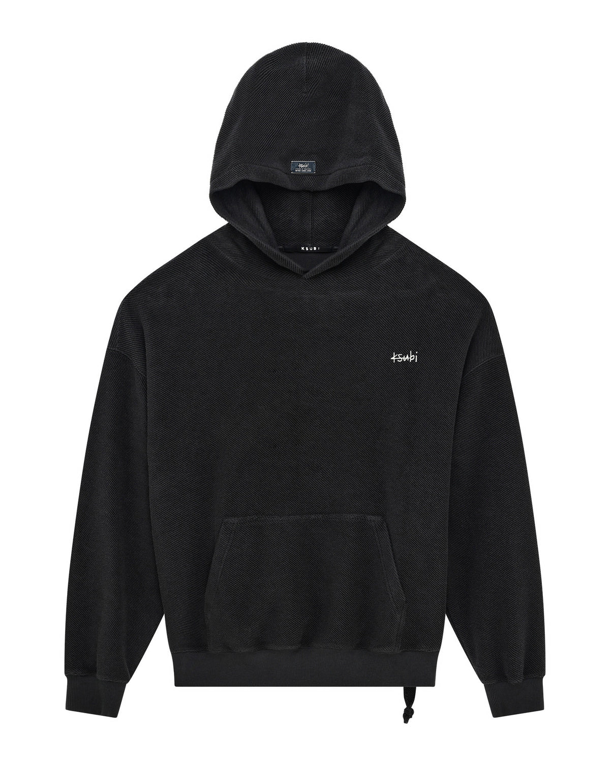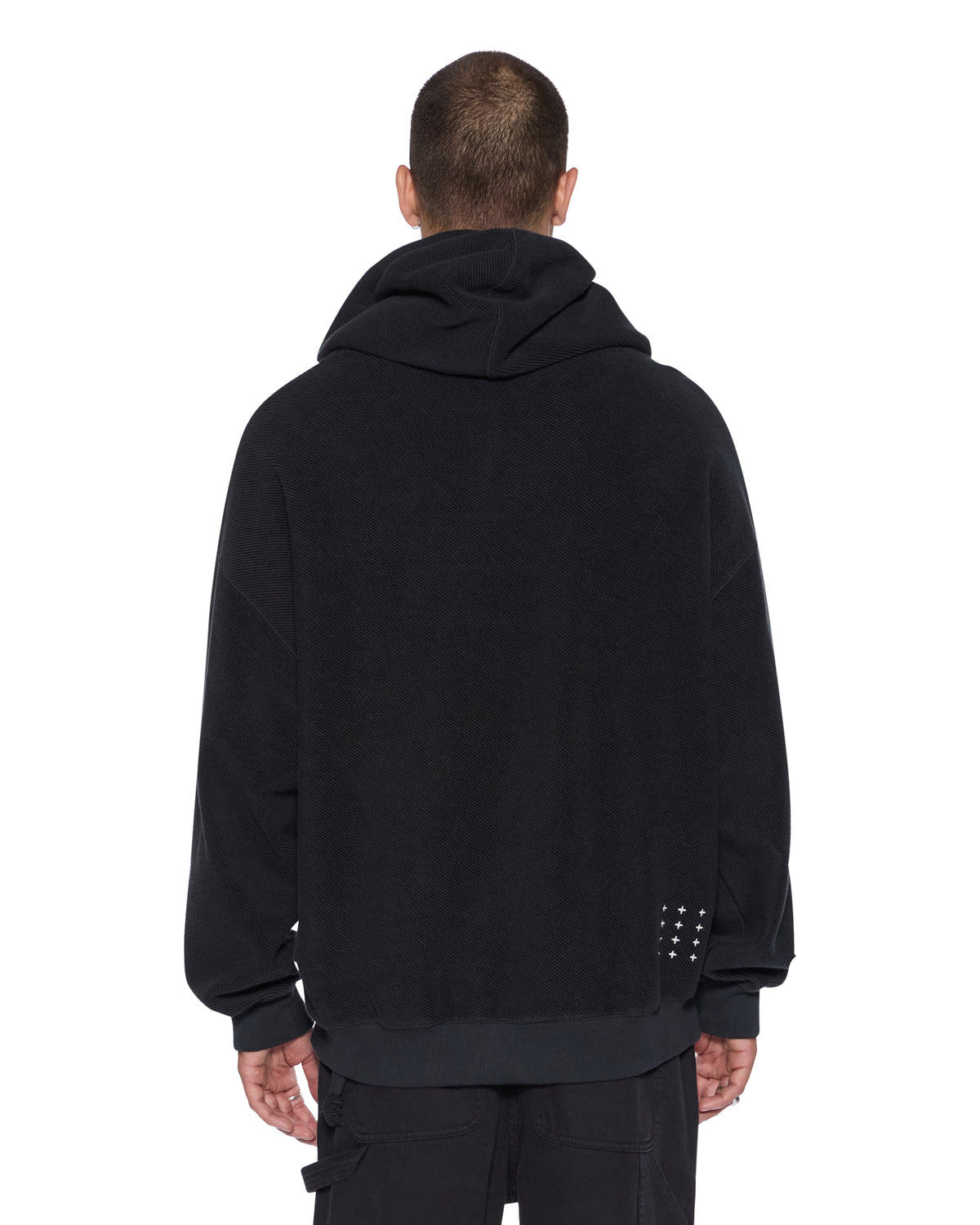 The 1999 Ekcess Hoodie Jet Black is a boxy oversized fit hoodie with a single-piece hood, front pouch pocket, and rats tail detail. Made from premium European heavyweight loopback fleece in a Jet Black colourway, it is finished with tonal T-box and 4x4 embroidery branding.