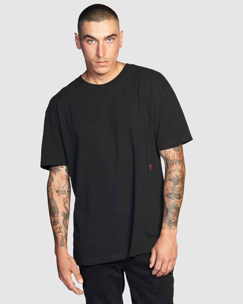 The 4 X 4 Biggie Ss Tee Black/Red is made from premium cotton jersey in black with aged wash. It features a red contrast extra large 4x4 cross print and Ksubi t-box print. It is an oversized short sleeve t-shirt with a raw-cut back hem, reverse overlocked side seam and signature rats tail.
