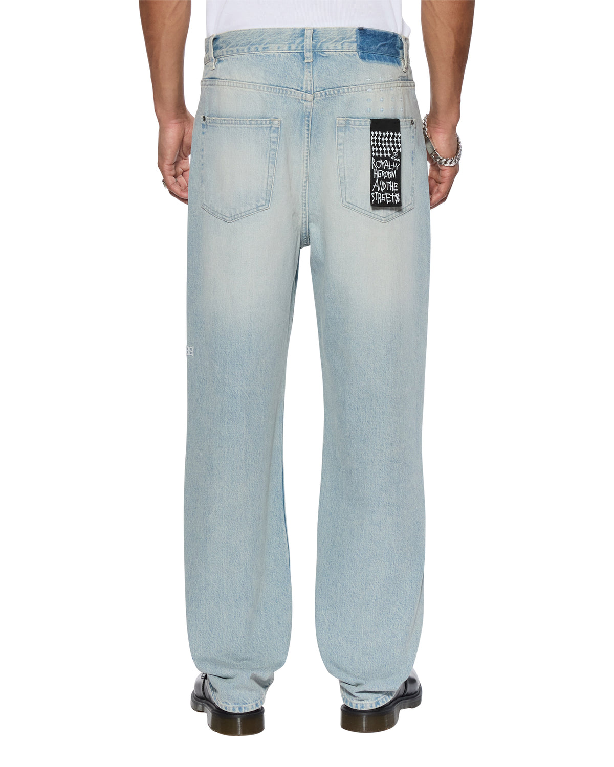 The Anti K Paragon is a mid-rise straight fit with a regular leg opening. Made from rigid European indigo denim with a heavy vintage-inspired stone wash, it features a tonal rip and repair deconstruction on the wearer's right knee. Finished with signature T-box and 4x4 embroidery, ghost patching detailing, and Ksubi branded hardware.
