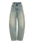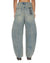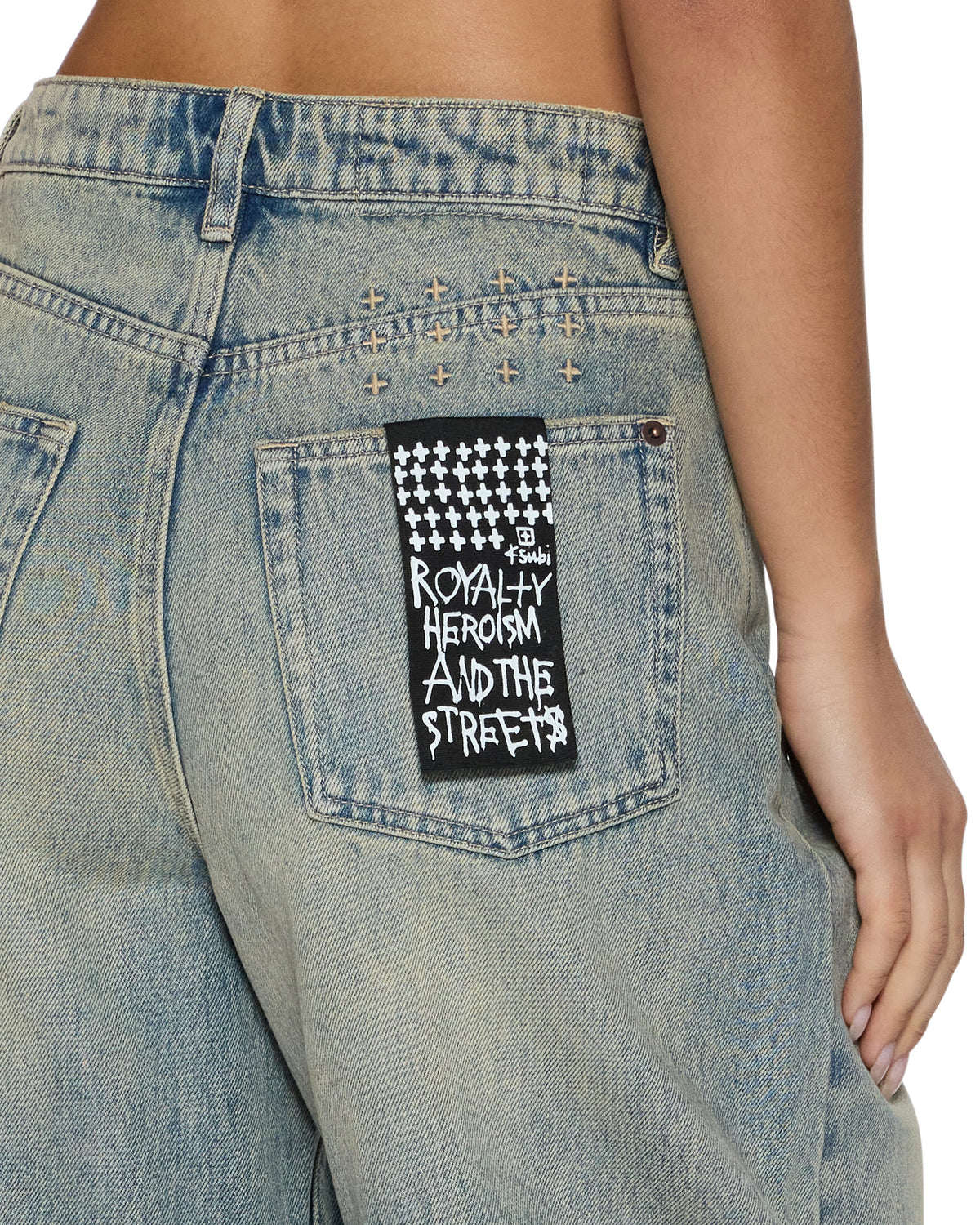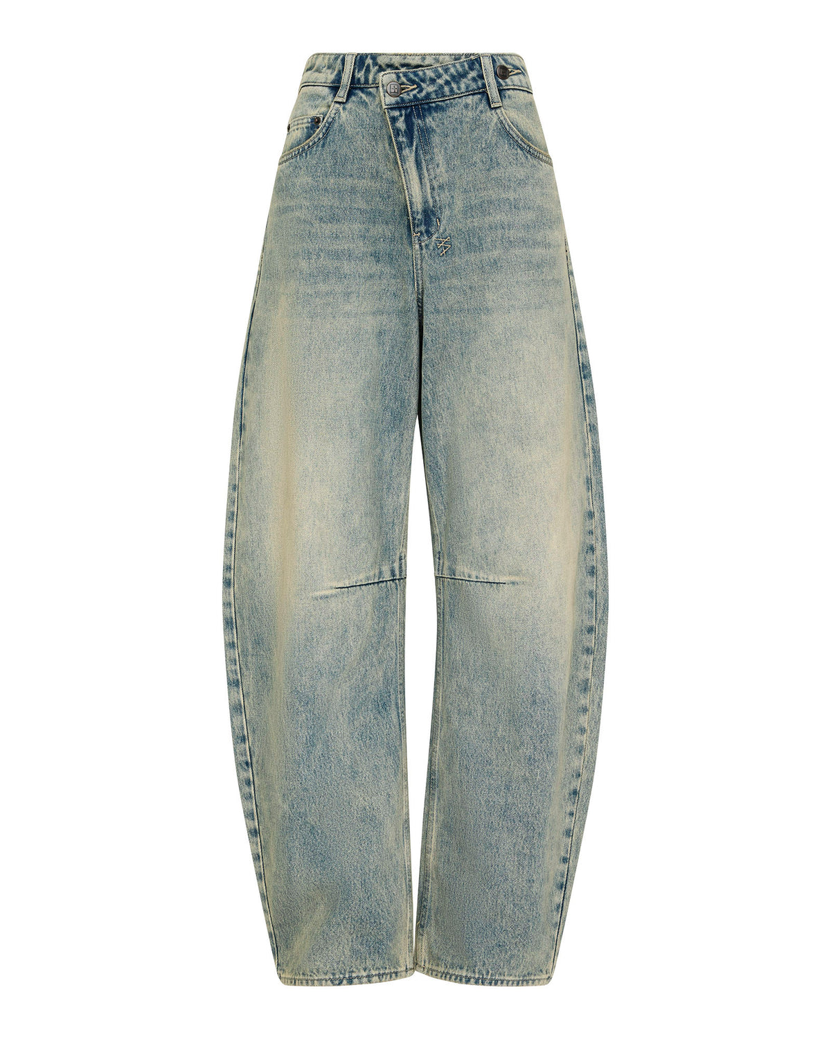 The Barrel Jean Folk is a mid-rise jean with a relaxed fit and distinctive barrel-shaped leg that tapers at the ankle. Made from premium rigid indigo blue denim with a subtle neutral tint and signs of wear, with subtle grinding at the waistband, pockets, and hem. It features an asymmetric waistband, classic five-pocket styling, with Ksubi branded hardware, T-box and 3x4 embroidery, and a removable pocket tag attached to the wearer's right back pocket. Designed to be a flattering and sculptural silhouette. Style back with Bolt Top Folk Blessings for an effortlessly chic look.