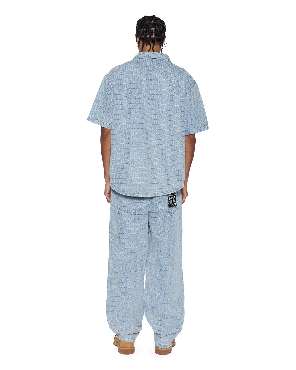The Boxer SS Shirt Tile is an oversized-fit short sleeve shirt with dropped shoulders, regular 2-piece collar, and stepped hem side seams. Made from premium rigid denim with a custom Ksubi jacquard and light stone wash, it features a chest pocket with W-bartak detail and a branded metal plate on the front pocket. Finished with T-box and 4x4 embroidery and Ksubi branded hardware.