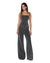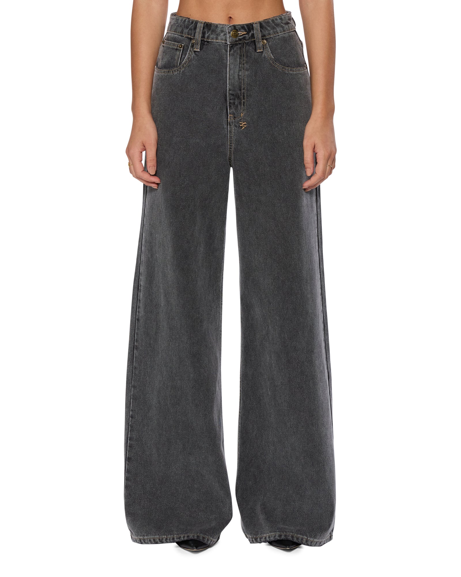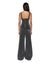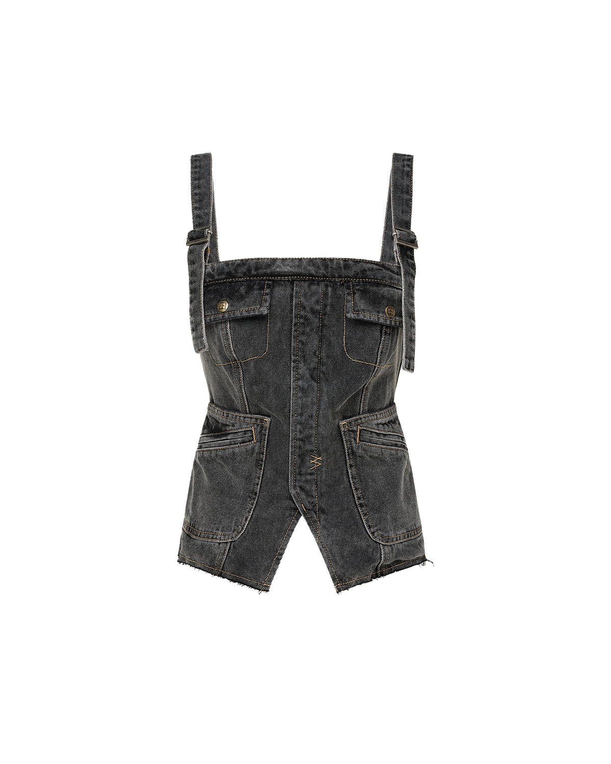 The Cargo Top Cinder is a fitted full-length bodice featuring a raw cut hem and self-adjustable straps, made from premium black stonewashed denim with tobacco topstitching. It includes front flap pockets, 3D zipper patch pockets, an exposed center back zipper, and is finished with T-box embroidery. Style back with the Soho Slouch Cargo Cinder for a cool-girl double denim look.