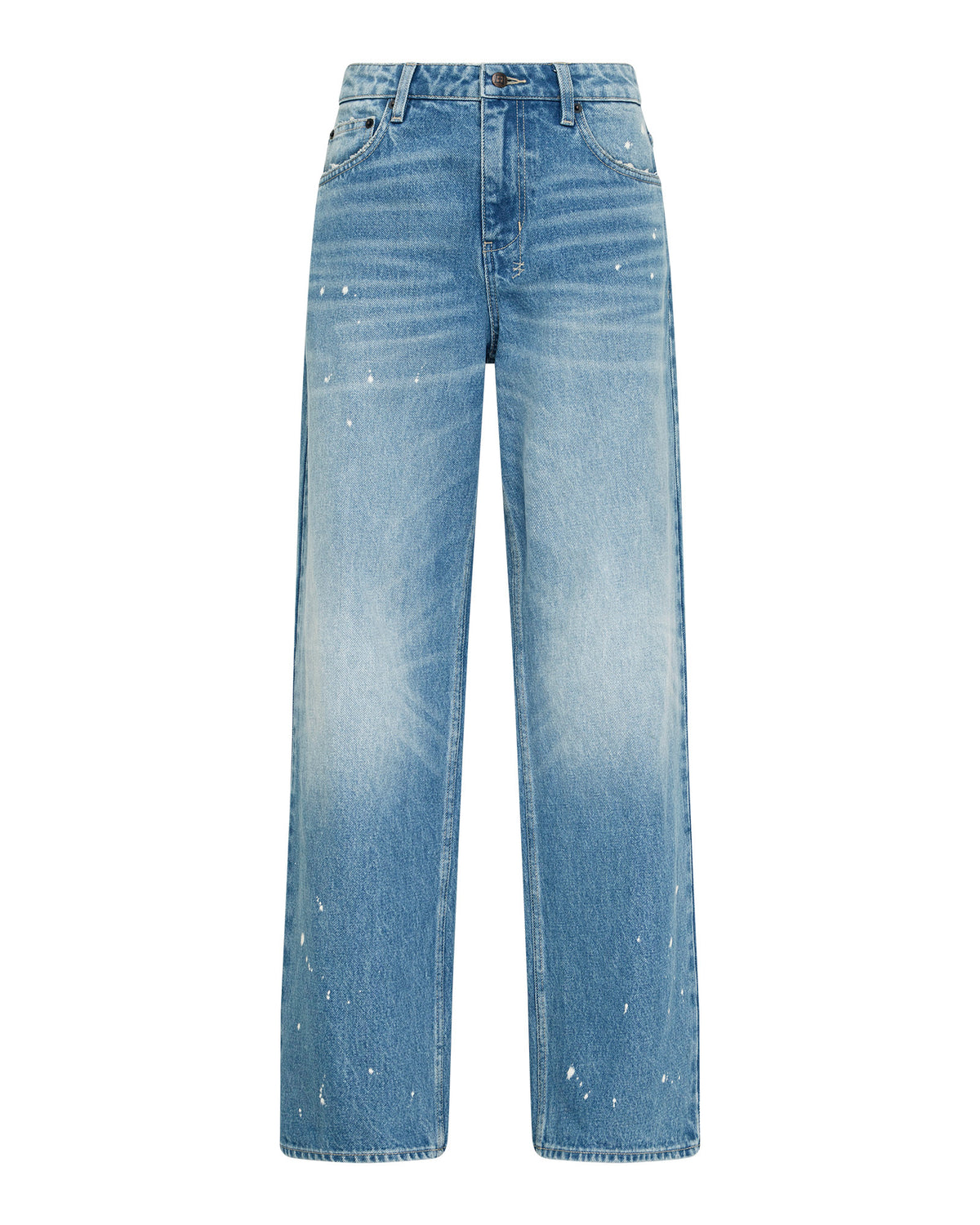 The Empire Jean Surge is a relaxed straight leg, full-length jean with a true mid-rise designed for everyday wear. Made from premium rigid denim in a classic vintage blue wash, it features grinding at the waistband, pockets and hem with sporadic bleach splatters, classic five-pocket styling, Ksubi branded hardware, T-box and 3x4 embroidery, and a removable pocket tag attached to the wearer's right back pocket.