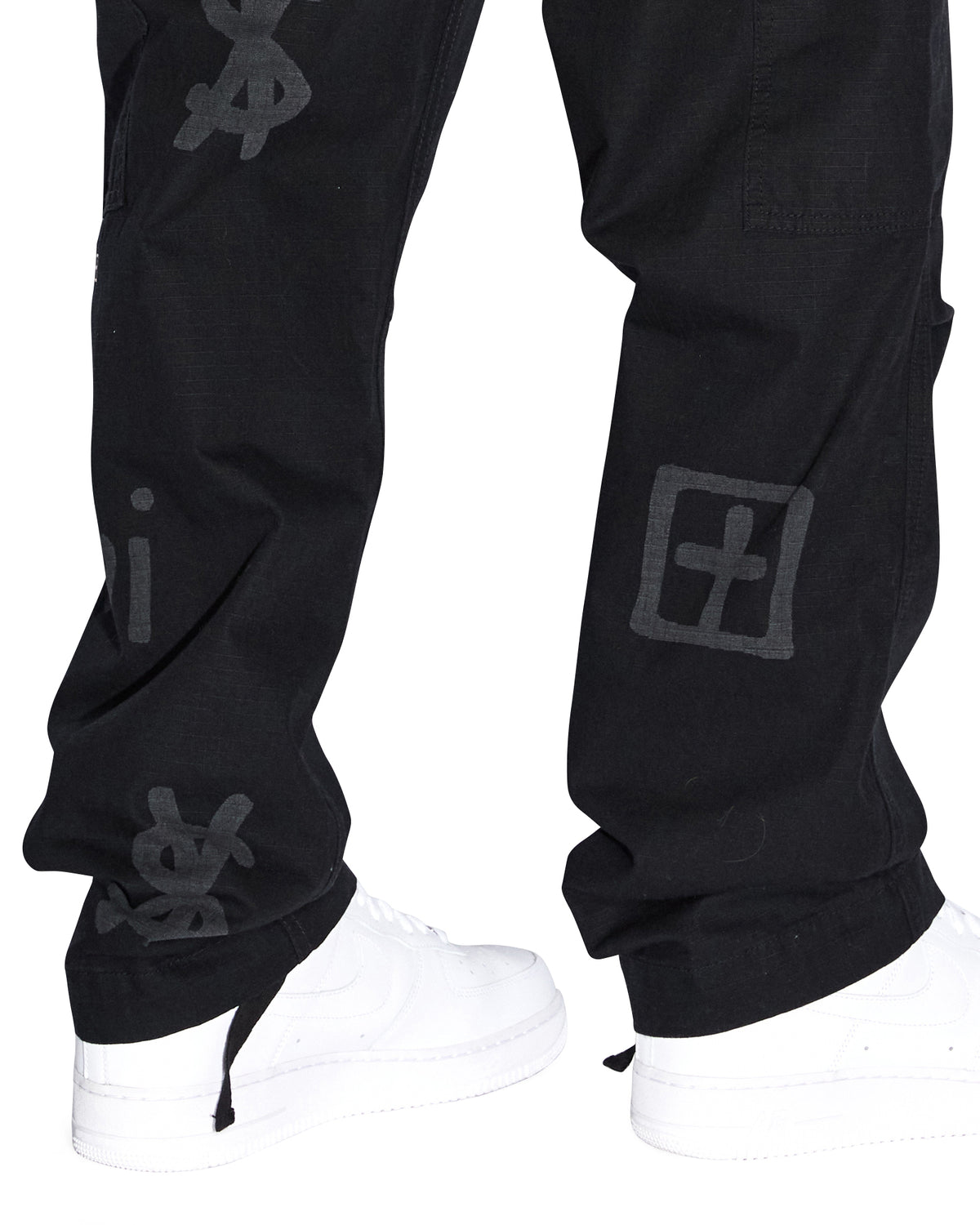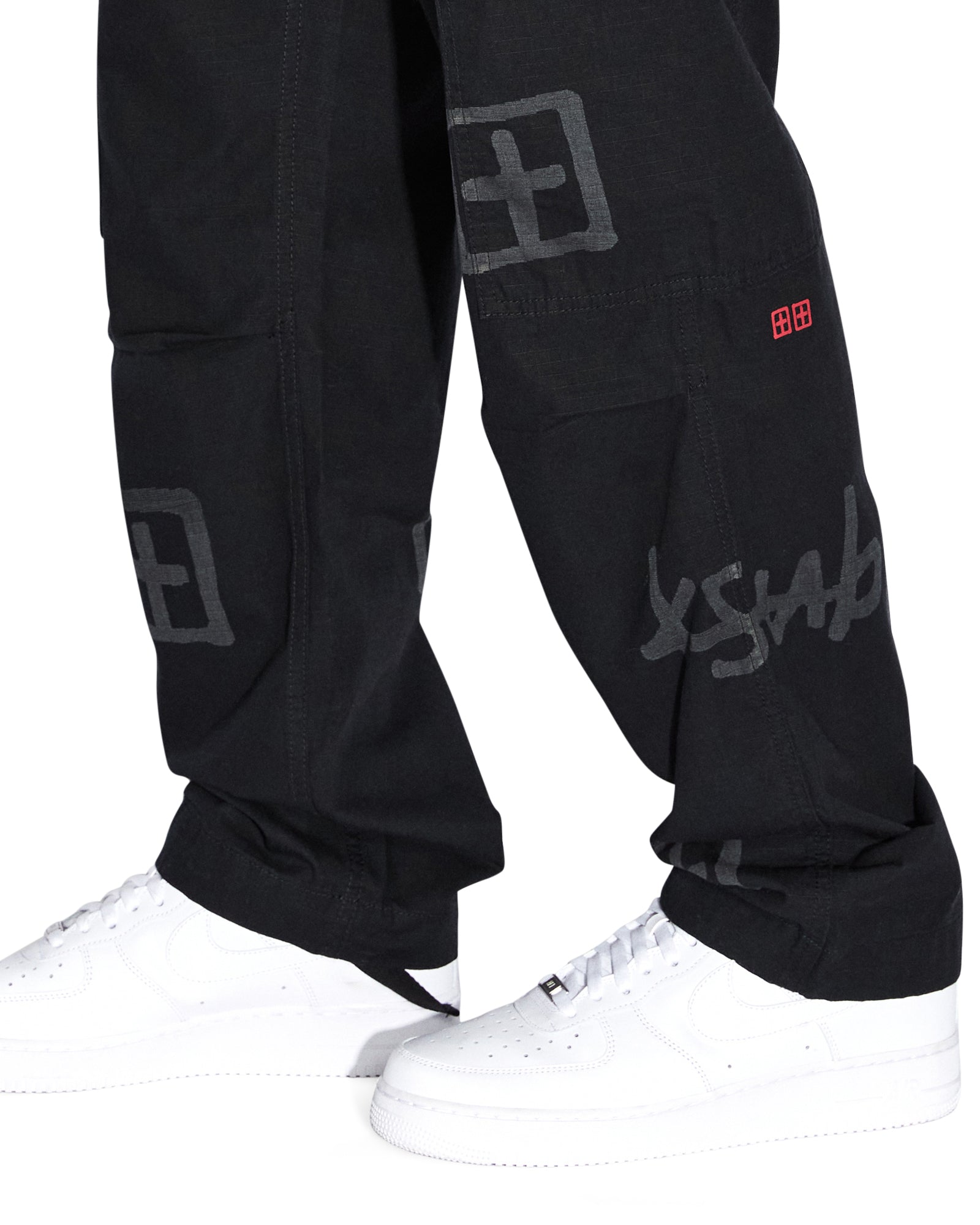 The Fugitive Cargo Pant Kash Box is a loose fit cargo pant with two cargo pockets on the sides, two pockets on the back and two on the front. This style is made from a cotton ripstop fabric with a laser printed t-box artwork scattered across the leg and detailed with tucks at the knees and drawstrings at the ankles. Signed off with 4x4 cross embroidery on the back and a Ksubi t-box print on the leg.