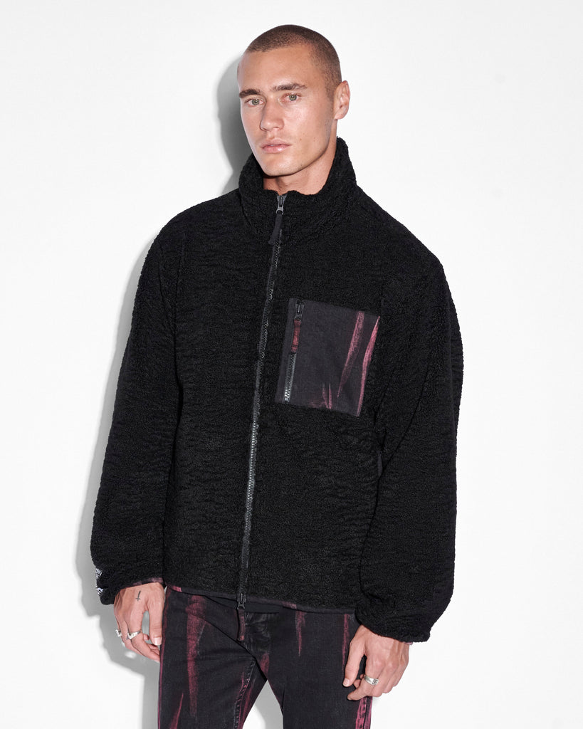 The Icebreaker Zip Thru is a relaxed fit, borg style jacket featuring fully lined interior side entry pockets with zippers and chest pocket with contrast denim details. The body is cut from a soft black poly sherpa fabric whilst the pockets, hem bands and zipper tabs are made from unique denim panels that have been bleached and re-dyed in the Ksubi Refrakt pattern. Finished with branded sleeve tag signature t-box and XL 4x4 embroidery on back.