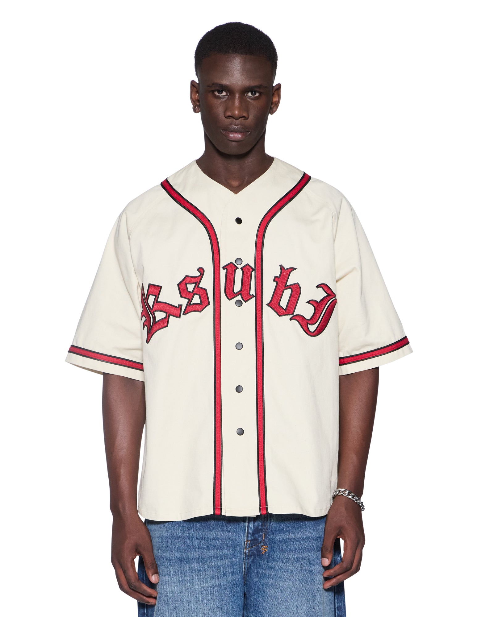 The Kball Baseball Jersey Desert is a boxy oversized fit baseball jersey with traditional baseball jersey construction, dropped raglan sleeves, a press-stud button closure at the front and signature rats tail detail. Constructed with seam piping and panel detailing, it is made from midweight cotton twill in a desert colourway with a soft wash. It features seasonal artworks embroidered across the front and back, finished with signature t-box and 4x4 embroidery branding.