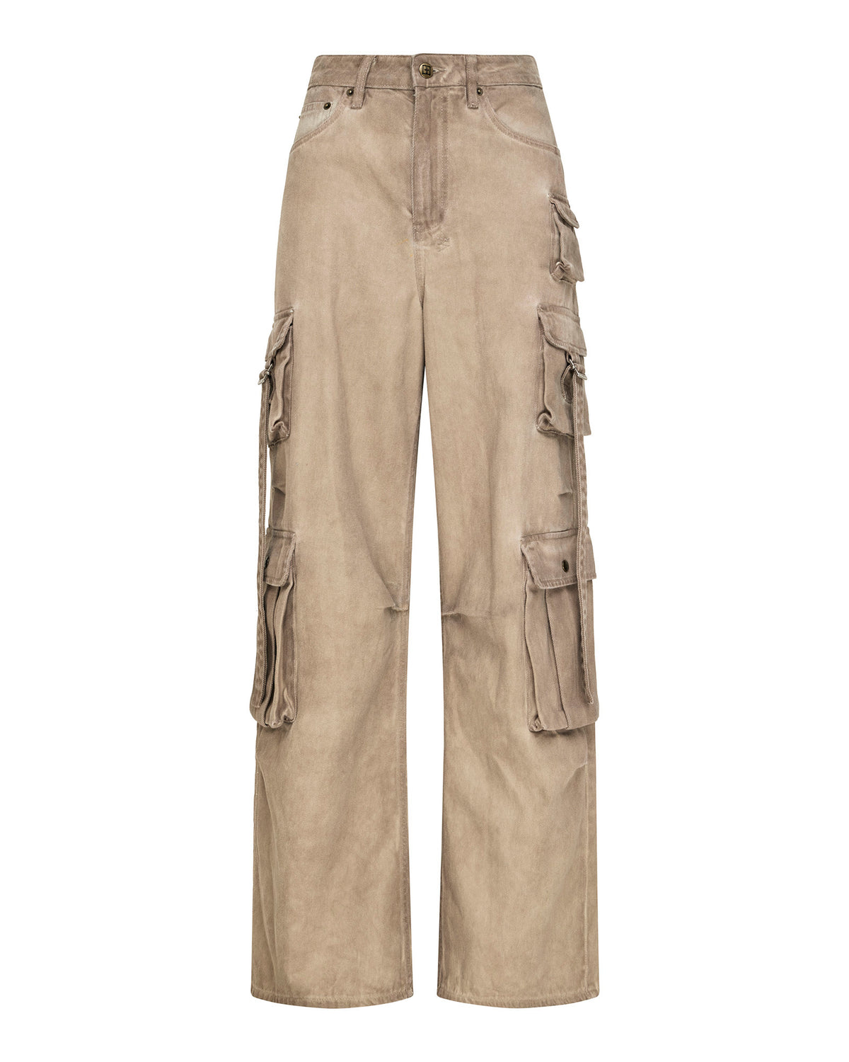 The Ksuper Cargo Terra is designed with a super low rise and full length. Made from heavyweight cotton canvas with a 'Terra' coloured overdye treatment, it features side-facing 3D patch pockets, back seat carpenter pockets, Ksubi branded hardware, T-box and 3x4 embroidery, and a removable pocket tag on the right back pocket. With a baggy silhouette, this jean offers maximum comfort and street-style edge, perfect for pairing with the Obscura Bralette Terra for an ultimate festival look.