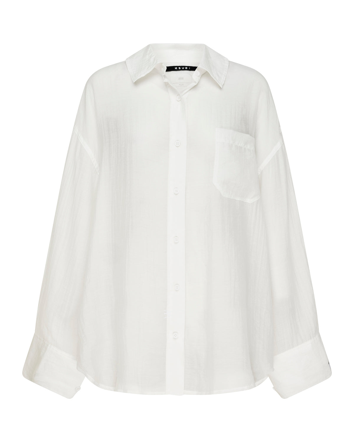 The Labels Astra Ls Shirt Black is an oversized button-up shirt, made from premium tencel blend sheer fabrication in a white colourway. Featuring a patch pocket, curved hem, and classic centre front collar with exaggerated cuffs. Finished with a Ksubi T-box and Cross dollar embroidery. Style back with any Ksubi denim for an off-duty elevated look.