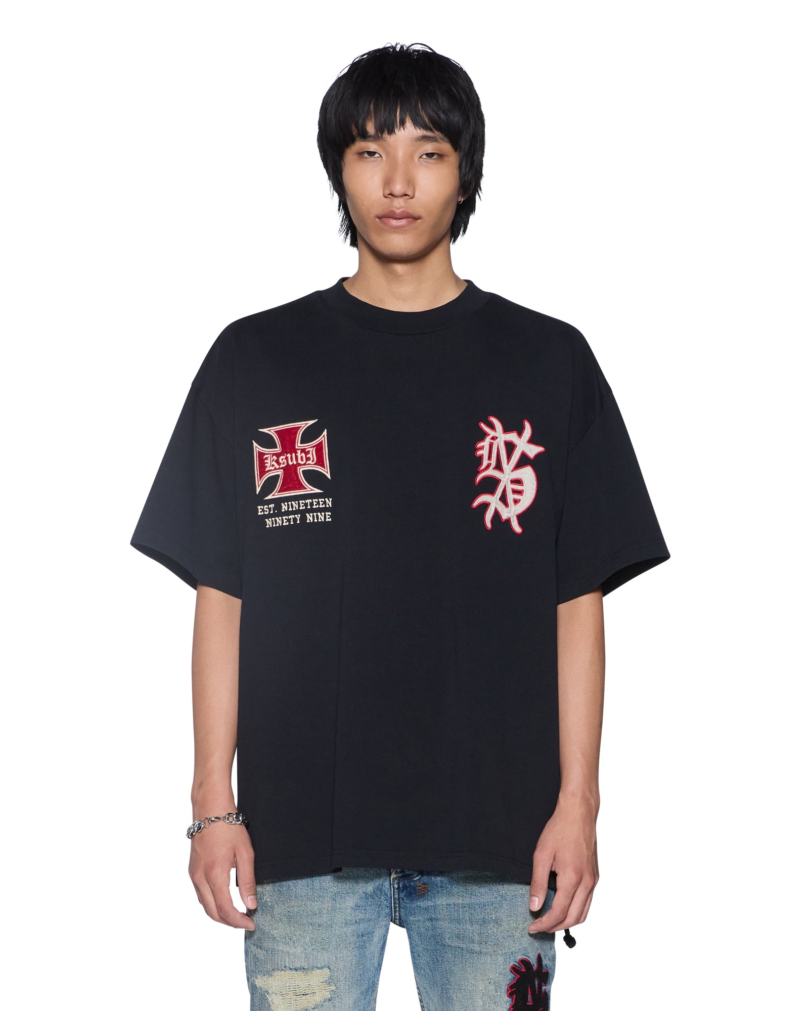 The League Ekcess Ss Tee Black is an oversized fit short sleeve t-shirt with a raw cut back hem, reverse overlocked side seam and signature rats tail. Made from premium cotton jersey in a garment dyed black, it features seasonal and core artworks embroidered and patched on the front and back. Finished with signature t-box and 4x4 branding.