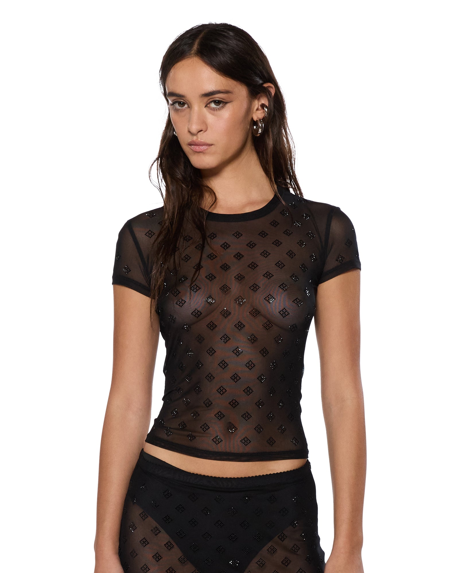 The Maxi Skirt Diamonte is a low-rise, slim-fit maxi skirt made from premium stretch mesh fabrication. Featuring custom T-box hot fix crystal yardage, a scalloped elasticated waistband, and a detachable brief lining, style it back with the Mesh SS Top Diamonte.