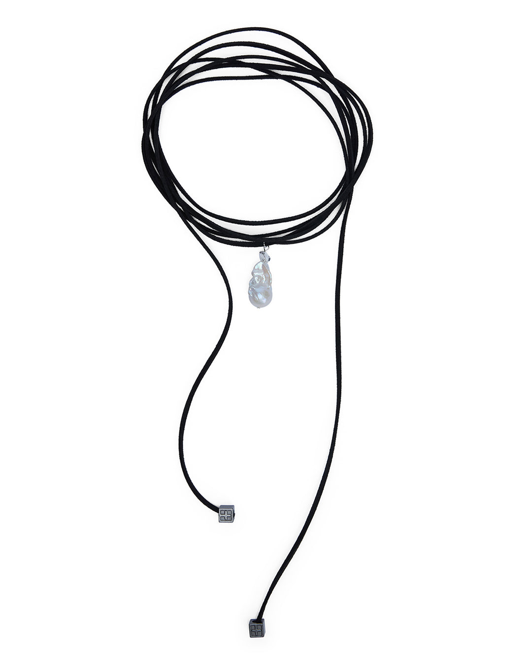 The Noir Pearl Choker is a refined, handmade piece featuring a natural baroque pearl suspended on a 2.5m length of supple black suede cord. Finished with a sterling silver post, silver pyrite stone, and signature gunmetal beads, this piece is raw elegance crafted from the finest materials.