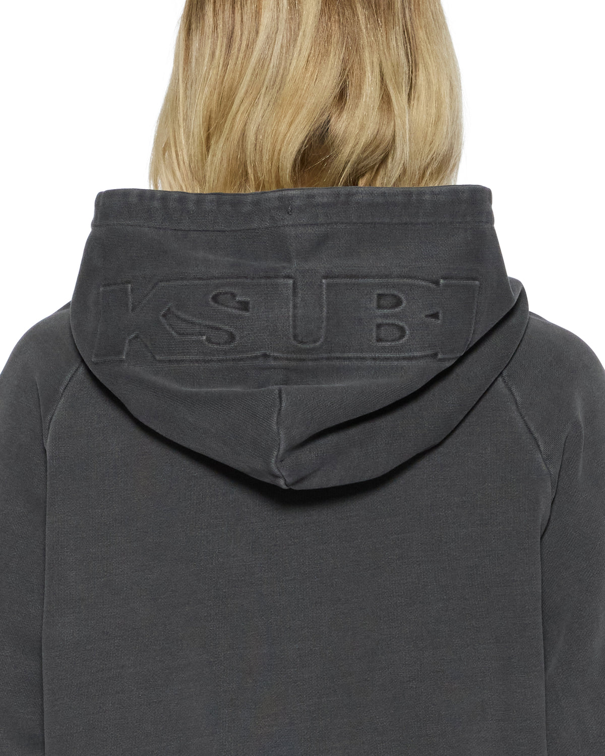 The Origin Hoodie Charcoal is an oversized boxy fit hoodie with raglan sleeves and rib hemband and cuffs. Made from a premium loop-back cotton fleece in our signature 'Charcoal' colourway with an aged wash to give the worn-in look. Featuring a front pouch pocket and Ksubi embossed branding across the front chest and top of the hood. Finished with Ksubi branded hardware and T-box and 3x4 embroidery.