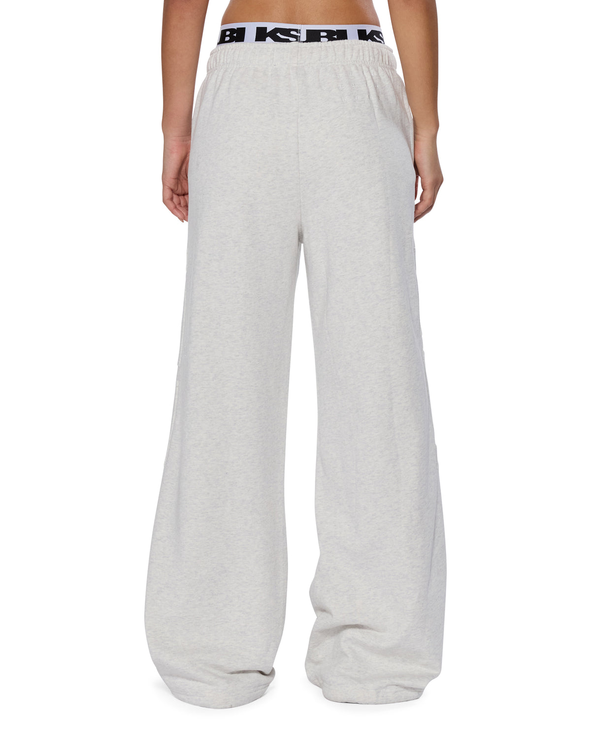 The SOTT Origin Trakpant Snow Marle is a wide-leg track pant with an elasticated waistband and drawcord designed to sit at the mid-waist. Made from premium cotton loop-back fleece in a vintage wash, it features SOTT embossed branding down the side of the legs, front welt pockets, and a hem drawcord with an internal snap to secure when cinched in. Finished with a front T-box print and Ksubi 3x4 and T-box branding, it pairs perfectly with the matching SOTT Origin Hoodie Snow Marle.