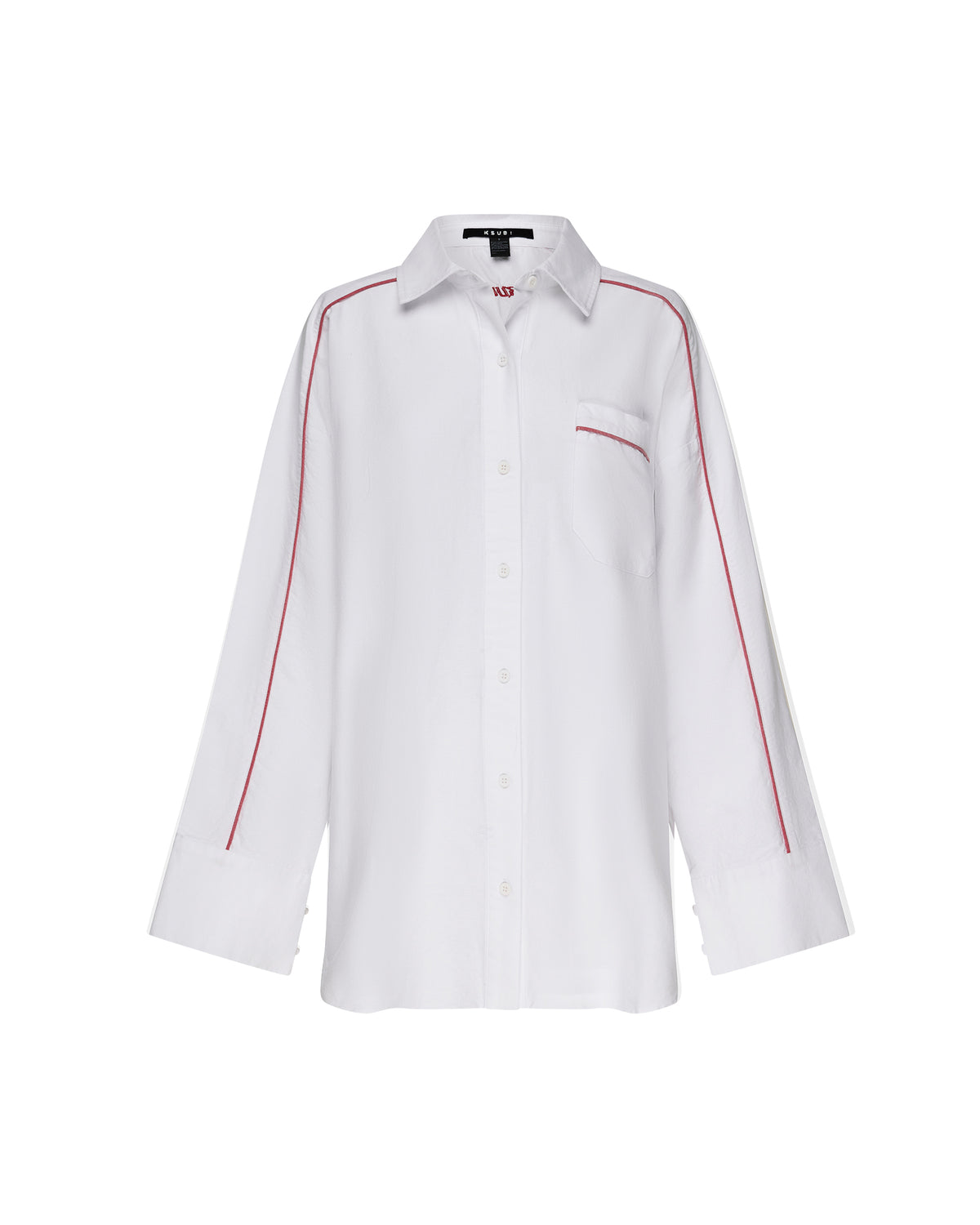 The Stinger Astra LS Shirt White/Red is an oversized button-up shirt made from premium 100% cotton oxford shirting fabric. It features a patch pocket, curved hem, and a classic center front collar with elongated cuffs, designed with contrast piping on sleeves and back panels. Finished with a seasonal Ksubi art hit at back neck and Ksubi T-box and Cross dollar embroidery.