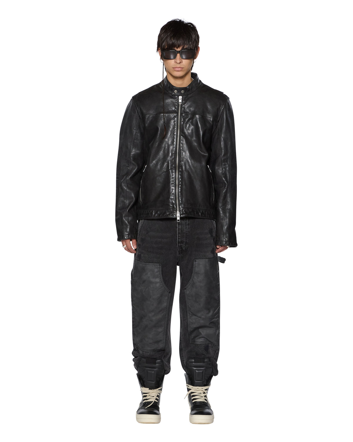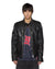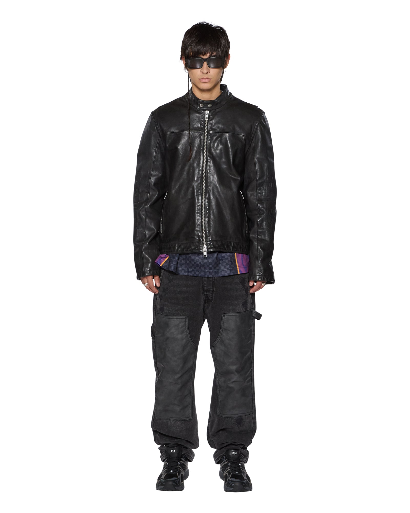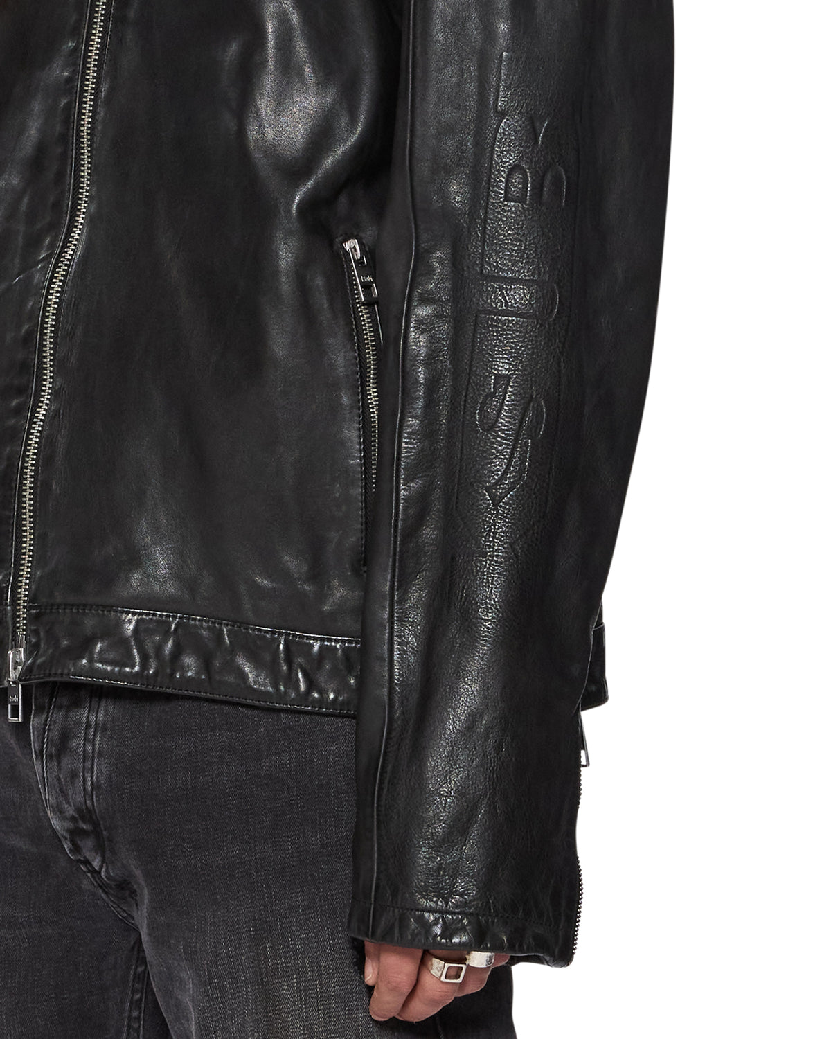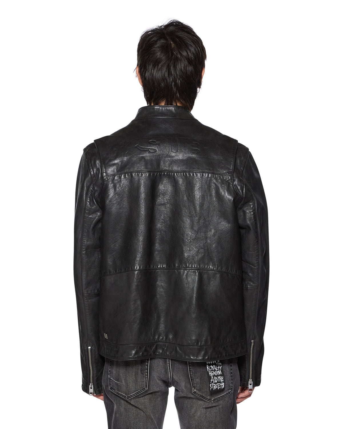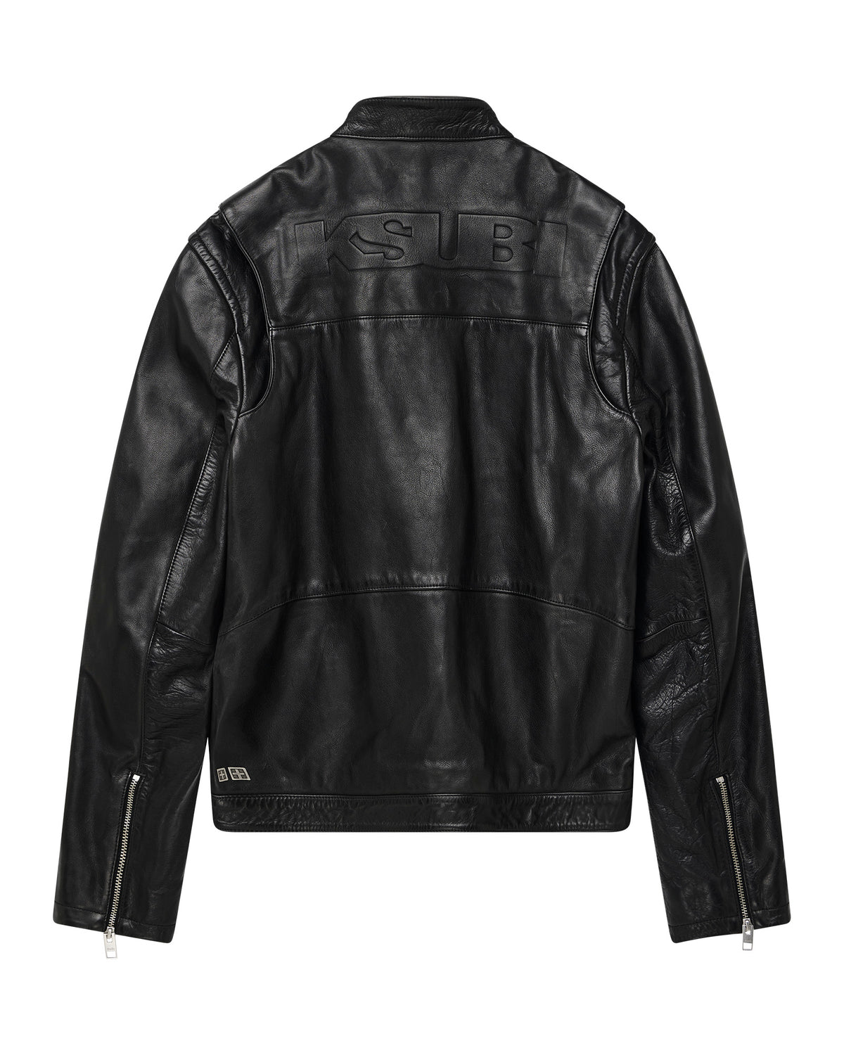 The Stinger Biker Moto Shell is a regular fit leather biker jacket with a double carriage zip-through front closure. Cut from premium cowhide leather, it features back action pleats, biker paneling, sleeve vents with leather gussets, exposed zip pocket entries, and an extended snap collar tab. A debossed 'Sign of the Times' Ksubi logo is displayed across the back and sleeves, finished with metal riveted T-box branding and Ksubi branded metal hardware.