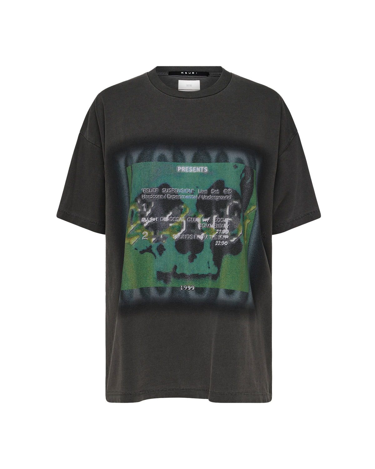 The Suspension Oh G Tee Charcoal is a Boyfriend fitted crew neck Tee with short sleeves and a heritage rat tail detail. Made from premium cotton jersey with a textured wash for a vintage hand feel, it includes a large back cut-out with a raw cut edge, subtle distressing on the front, and an exclusive Ksubi graphic along with T-box embroidery.