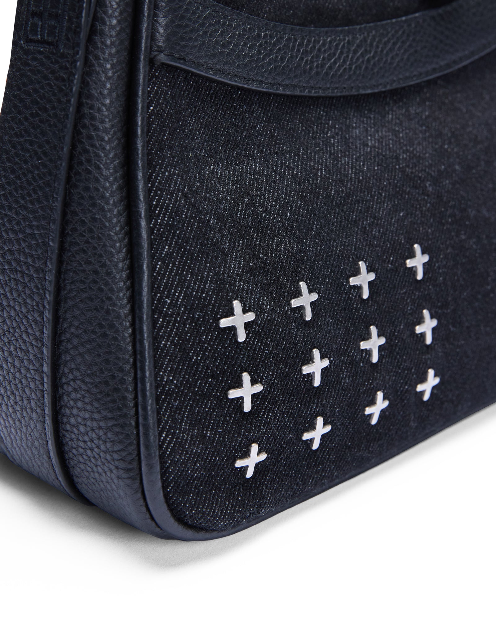 The Trash Bag Mini Noir Denim is a compact, statement bag crafted from premium denim, featuring a front D-ring strap for chaotic customisation—perfect for adding your favourite charms. It includes a detachable self-fabric shoulder strap, external back pocket, metal 4x4 logo on the back, Ksubi-branded zipper pullers, cotton tonal lining, an internal snap-closure pocket, and a Ksubi-branded plaque for a polished finish.