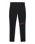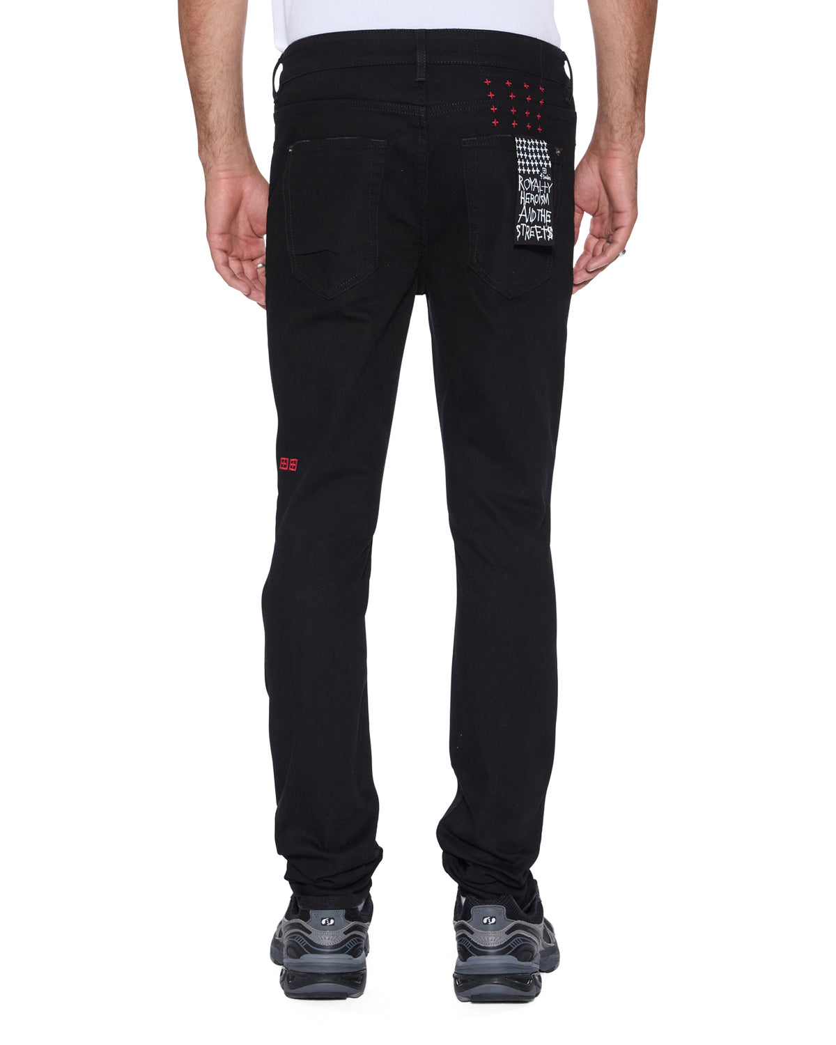 The Van Winkle Laid Black Sting is a mid-rise five-pocket full length skinny jean. Made from premium comfort stretch black denim with a light garment wash. Constructed with unique angled belt loops and front fly seam detail. Featuring knee deconstruction on the left knee partnered with seasonal printed art. Finished with T-box and 4x4 embroidery, ghost patching detailing, and Ksubi branded hardware.